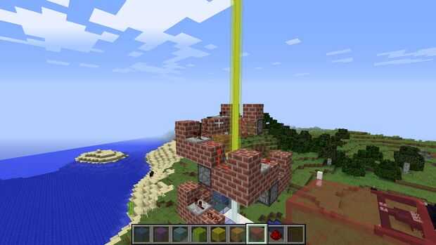 aquí es un modelo pequeño que brilla intensamente de una baliza del juego Minecraft. La luz proviene de un proyector LED barato. El LED, baterías y el interruptor están en la base (la parte cubierto de cinta aislante negra, hecha de una hoja de alu