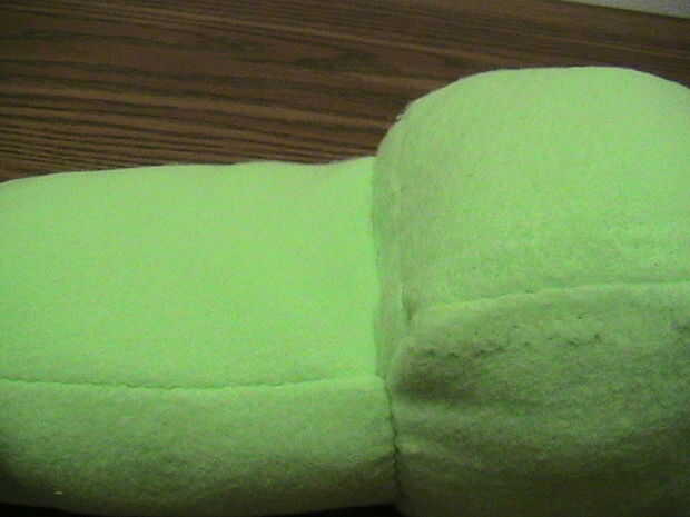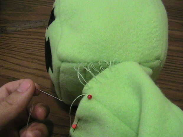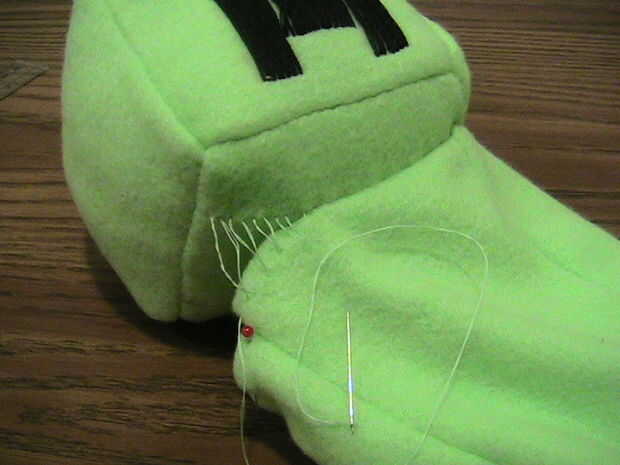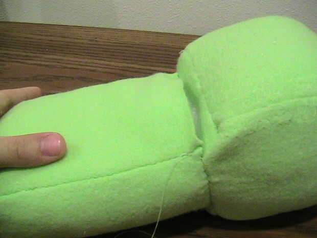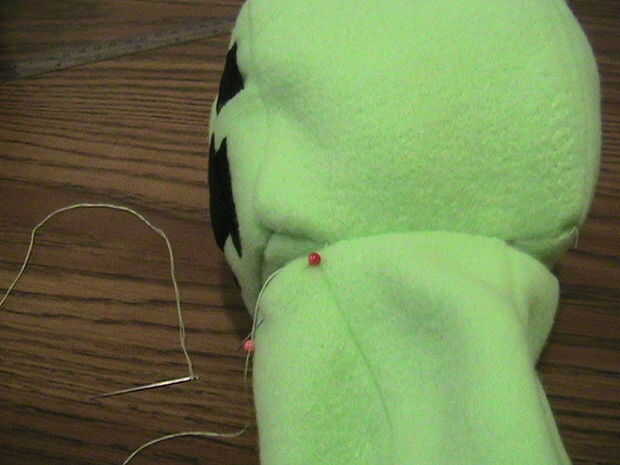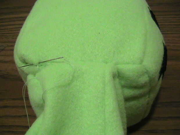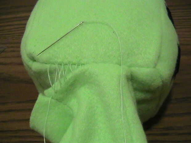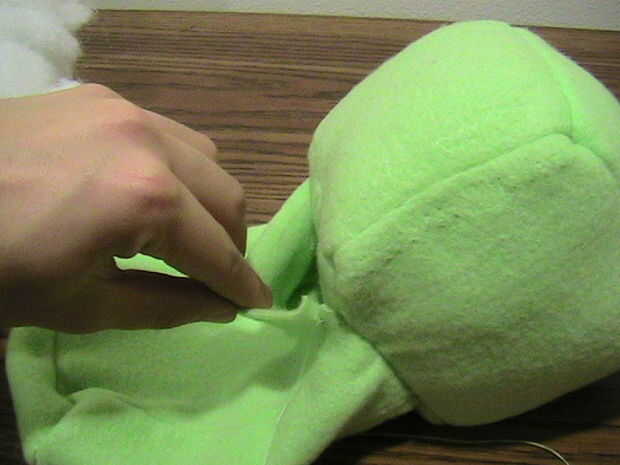 Dibujar un contorno de 2 "X 4" en el centro de la parte inferior de la cabeza. Utilice este cuadro como el panel superior del cuerpo. Con la puntada de resbalón, coser tres lados del cuerpo a la cabeza a lo largo de la línea, dejando abierta la parte de atrás.