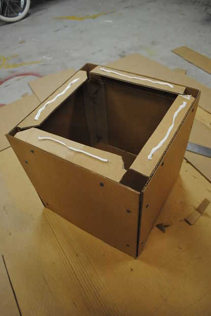 La cuarta superficie lateral es agregada y unida otra vez con ángulos de cartón. Si mi lámina de cartón fueron lo suficientemente grande, habría hecho este doblez justo abajo de la superficie superior.