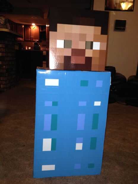 He comprado la Steve Head y luego había hecho el cuerpo. Usé una caja de cartón mediana y 3 colores diferentes de cinta azul. También usé blanco. Cubrir la caja completa con cinta aislante, capas los colores para mostrar los cuadrados de color blanco o acento.