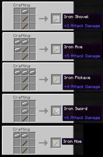De todos los minerales, sólo puede hacer armas, herramientas y armaduras de hierro, oro y diamantes. Todos tienen diferente durabilidad y resistencia y son hechos a la misma para cada mineral.