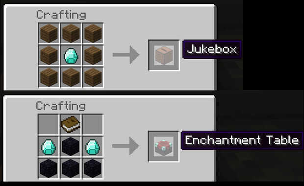 • 1 libro + 2 gemas de diamante + 4 bloques de obsidiana del arte = tabla de encanto
