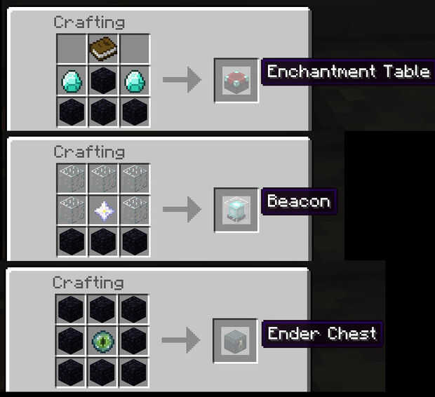 - 8 bloques de obsidiana + ojo de Ender = pecho Ender: actúa como un pecho normal de almacenamiento, excepto usted puede acceder a contenidos de un pecho de Ender de otro