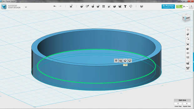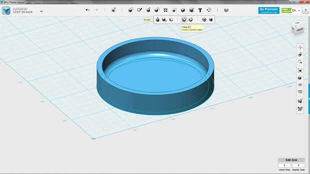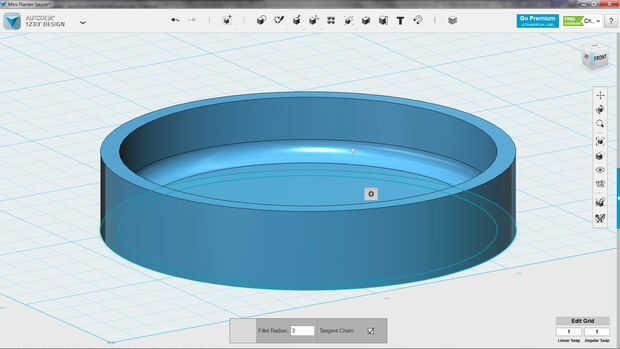 Vamos a utilizar el comando de filete, este comando suaviza la transición entre dos zonas que se conectan. En este caso estamos redondeando el borde interior del platillo desde ángulos ajustados son más difíciles de limpiar. Botón izquierdo del ratón sobre la línea interior de fondo en el plantador, puede que necesite ajustar el ángulo de visión para obtener la selección correcta. Una vez que seleccione algunas opciones vendrán bajo el icono de engranaje gris. Queremos elegir la opción de filete. En la parte inferior que le preguntará cuánto queremos filete, escriba 3 y se le mostrará cómo que se vería, como con todo lo demás no dude en probar diferente que yo, pero voy a pegar con una transición de 3 mm. Pulse Enter.