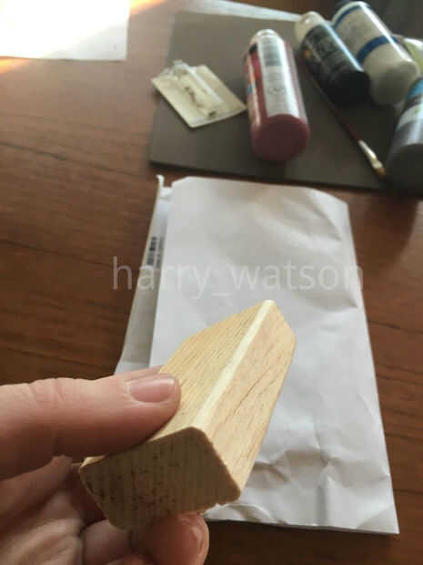 Para empezar, corte la madera a su tamaño. La pieza debe medir 1 1/2 pulgadas a través y 2 5/8ths largo. Para esto cortar recto, utilicé una sierra de mano y una caja de ingletes, que debe estar disponible gratis en la tienda al lado de su moldeado. Si no es así, pregunte si puede cortar para usted, si no tienes una sierra.