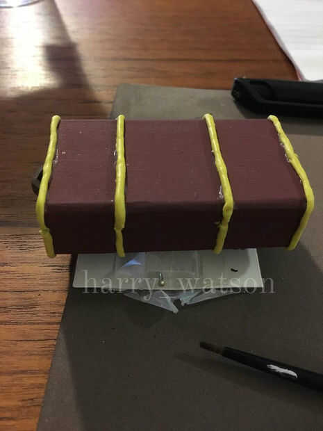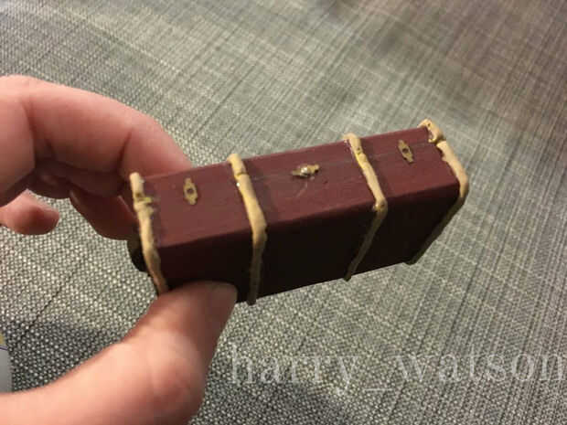 Estirar la plastilina por lo que es muy fino y pegar en el tronco como se muestra. Cada borde está cubierto y dos en el medio. También usé el borde de una tarjeta de crédito para pellizcar las bandas donde abra y cierre la tapa del tronco. Pasa nada si se ve un poco áspero - estos troncos son viejo y golpeado para arriba.