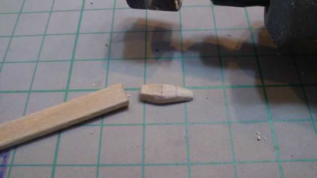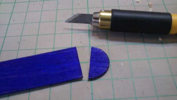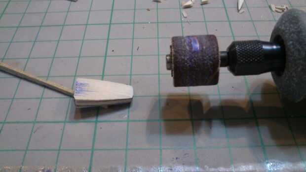 Comencé cortando el extremo redondeado con un cuchillo de arte. Que necesitaba cortar 3 piezas iguales para compensar los espesores requeridos como se muestra en los esquemas. Después de pegar las piezas y ajuste a que se sequen (al menos una hora), comenzó a formar con la herramienta de la moto de dremel con un accesorio de lijadora de tambor.