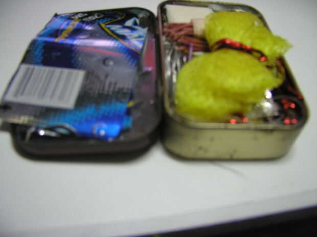 esto es una pequeña lata que una vez fue una lata de la menta.Lo que hice fue arena de la pintura. Se carga con algunos artículos que podrían ayudar en fuego haciendo, un elemento clave en la supervivencia. Es 2 1/2 de ancho, 2 de largo y 3/4 en alta
