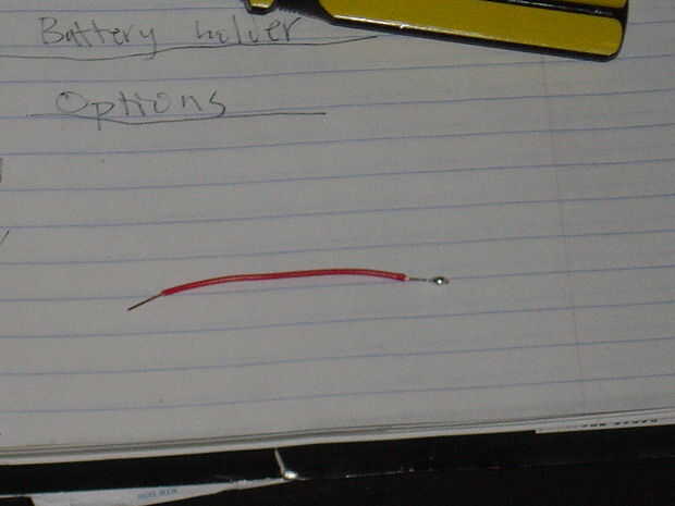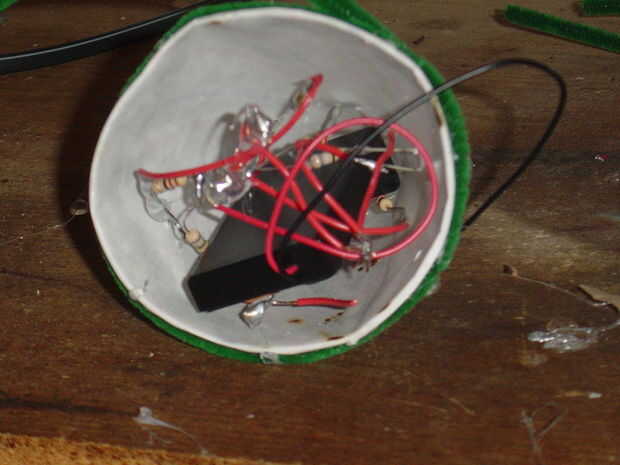 Finalmente, soldado el extremo positivo de la batería (con interruptor) a las patas positivas de los LEDs. Soldar el extremo negativo de la batería a las patas negativas de los LEDs. Sólo entonces puede empujar la batería dentro del árbol. Debe haber espacio.