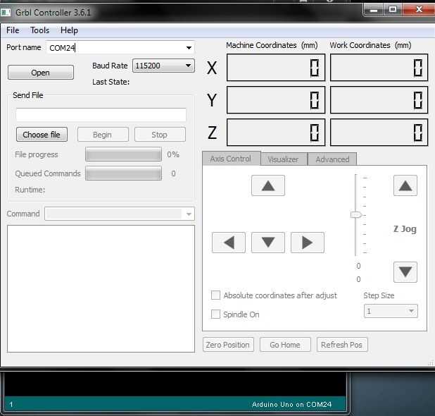 4. una vez había instalado Grbl en su Arduino Abra el controlador Grbl y seleccione el puerto al que está conectado el Arduino. Presione el botón open.