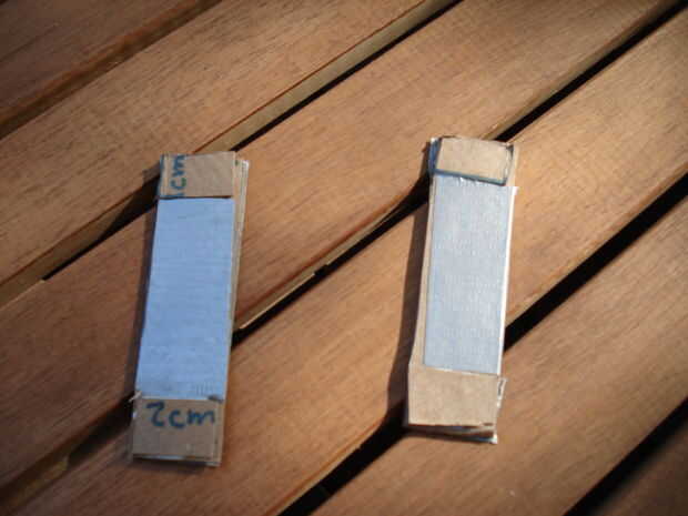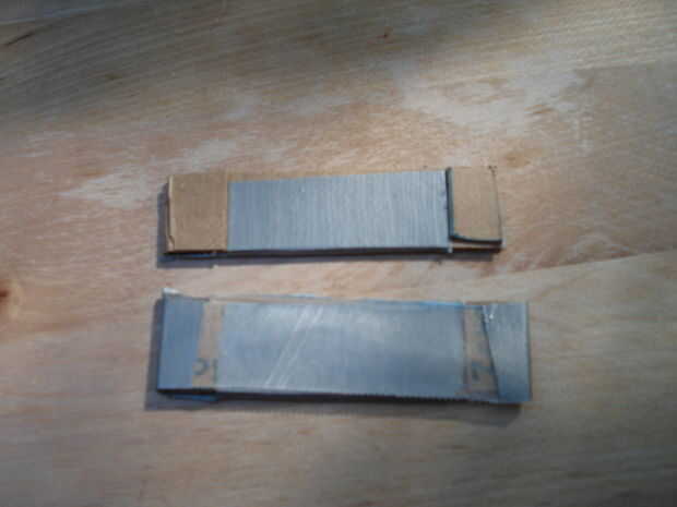 Ahora es necesario utilizar el papel encerado. El pedazo de papel de cera es 8cm de ancho y 2cm de altura. El siguiente es la grabación, hacer este pedazo de cinta de 4 cm de alto y 8cm de ancho, con cortes en las esquinas superiores suficientemente grandes para que los pequeños pedazos de cartón. Hacer dos de estas piezas de cinta y ponerlos en el doblado piezas de cartón, asegúrese de que un lado de la cartulina tiene el lado de la cinta en él que no tiene los agujeros. Ahora toma los pequeños pedazos de cartón y pegamento o cinta les para las manchas en la cartulina que no tienen cinta sobre ellos. Hacer esto con los cuatro. Ahora poner en el papel de cera, cinta adhesiva a ambos lados de la cartulina overtop de los pequeños pedazos de cartón.
