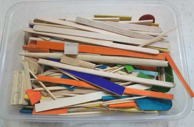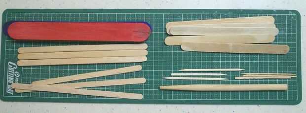 Los materiales utilizados fueron diferentes tamaños y tipos de palos de paletas, agitadores del café madera y palillos. Los palitos color 'tamaño de depresor de lengüeta' fueron utilizados en el montaje final para apuntalar el conjunto de motor impulsor en el mismo nivel con las patas de los caminantes mecánica. Un trozo de palillo de bambú fue utilizado para el sistema de giro la torreta principal de conexión con el conjunto de accionamiento del motor. También útil eran pedazos de mi caja de 'repuestos' para partes pequeños simulada mini blaster como lanzador de la Granada de concusión montados en ambos lados de la torreta. 'Repuestos' eran las sobras de otros proyectos de palo de paleta.