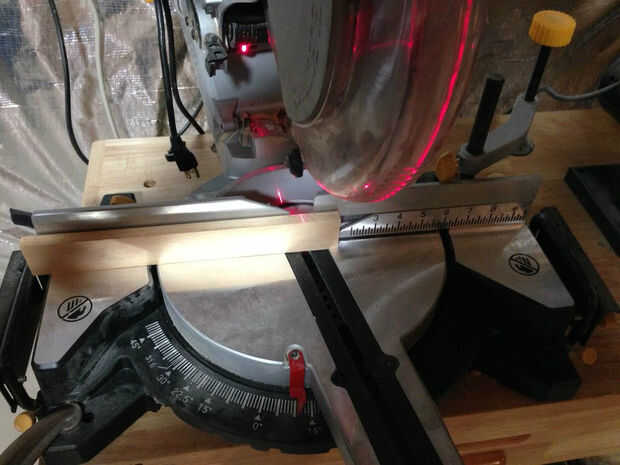Comience con la parte inferior. Configurar la sierra para un ángulo de 40,8 grados (90 – 49.2). Corte un chaflán. Invierta la pieza de trabajo y corte el chaflán mismo en el otro lado. Corte mucho y luego hizo unos cortes adicionales hasta que iguale la longitud de la parte inferior.