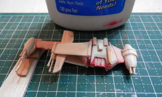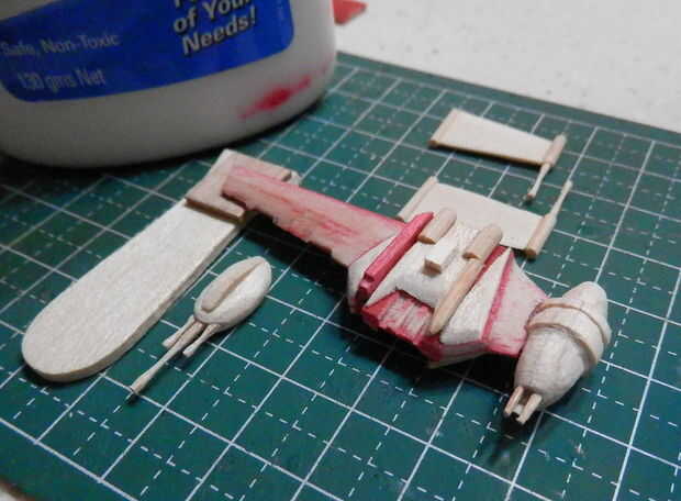 Cuando se haya secado el pegamento entre las dos mitades de la Asamblea de perfil primario, las alas S-hoja estaban pegadas a la base de las alas en una posición doblada. Añadir la vaina de armas al final de la superficie de sustentación primaria completa el ala-b en crucero/modo del aterrizaje.