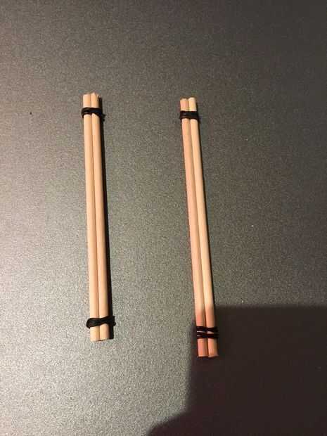Poner las dos pequeñas bandas de goma en cada extremo de las espigas (después de poner los tacos juntos en pares) para que los tacos más pequeños ahora están en parejas