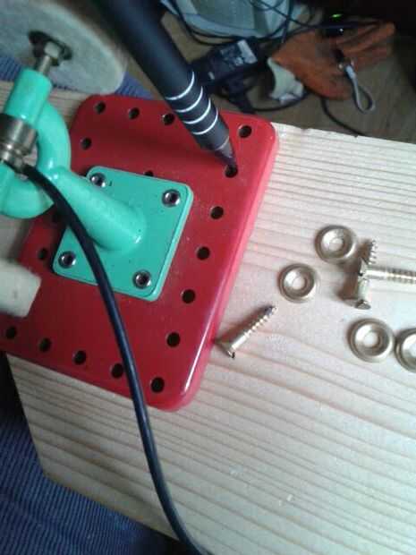 utilicé un pice de 4 "× 3/4" madera tablero algunos #6 × 1 "tornillos para madera y tornillo de tazas. Marque la posición de los agujeros que van a utilizar. Hacer agujeros piloto usaba una gimmlet pero una broca muy pequeña haría. el molino hasta la Junta del tornillo.