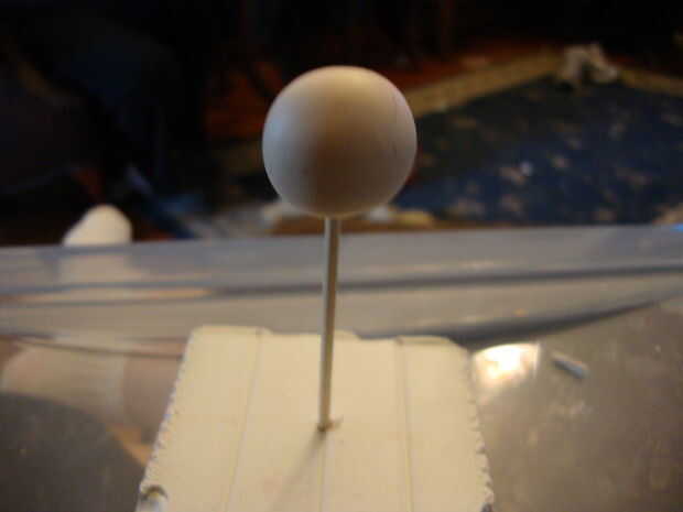 Rodillo de una pieza de barro amarillento en una bola y colóquela sobre una selección de diente.  Puse el otro extremo de mi selección de diente en un bloque de sculpey que había conseguido bastante difícil y necesita suavizante, pero por ahora es una gran manera de mantener la selección de diente mientras trabajo en otras partes.