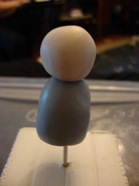 Tomar algunos arcilla negra y blanca y mezcle por agachados y rodar hasta que la arcilla es del mismo color a través hacia fuera.  Formar parte de ese barro y rodar un cilindro grande. Pasar a la cabeza.  Con sus herramientas de corte cualquier arcilla de acceso que usted podría sentir pasado necesidades y darse un lugar para las piernas de Batman ir.