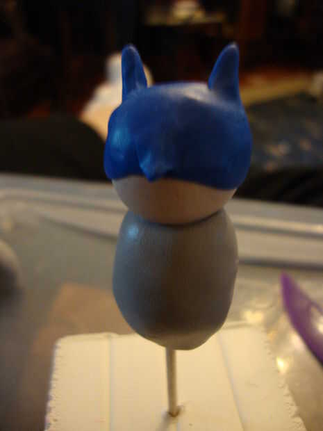Rodillo hacia fuera un pedazo de arcilla azul y colóquelo sobre la parte superior de la cabeza de Batman.  Tome un pedazo pequeño de eso Arcilla azul y pellizcar en tres triángulos.  Dos de esos triángulos irá en la parte superior de la capucha de Batman para oídos, lat pasará a la parte inferior de la máscara de la nariz.  Con un palillo de dientes o los dedos, suave las piezas juntos.