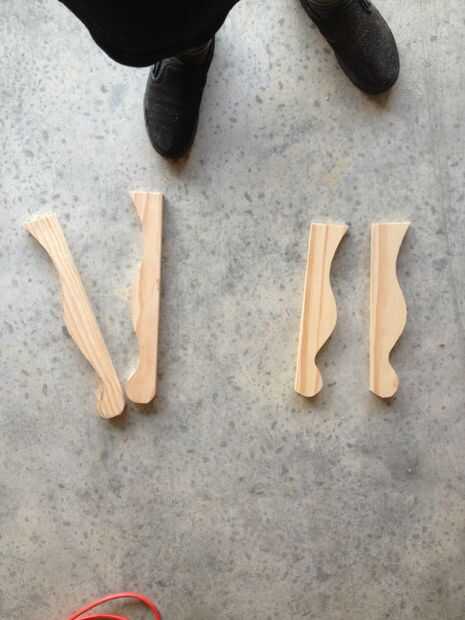 Utilicé restos de madera y corte a medida 1 x 3 un bosquejó el diseño sobre la madera. Recortar con una sierra de calar. Jefe junta las piernas son unos 16-18 pulgadas y el tablero de pie es alrededor de 9-12 pulgadas. Después de los cortes recuerda a la arena.