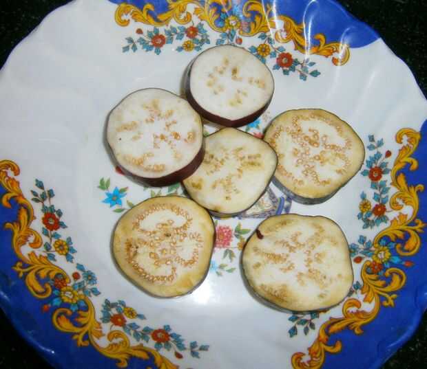 Cortar la berenjena en sentido horizontal. Obtener algunas rebanadas grandes de la media.