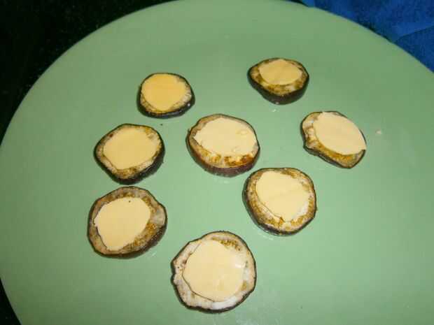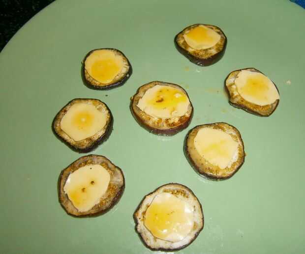 Añadir la salsa de Pizza y loncha de queso (cortado en rondas) sobre la berenjena al horno.