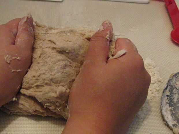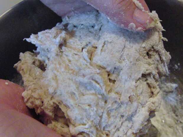 Ahora se debe activar la levadura. Debe haber espuma o burbujas en la parte superior de la mezcla de levadura. Agregue esto a la harina y mezclar. Agregar harina extra si es necesario (ver fotos abajo para ver ejemplos de masa, que es demasiado húmeda). Amasar (empuje hacia abajo la masa, vuelta y empuje hacia abajo otra vez) la masa durante unos cinco minutos. Deje que la sit de la masa durante 10 minutos.