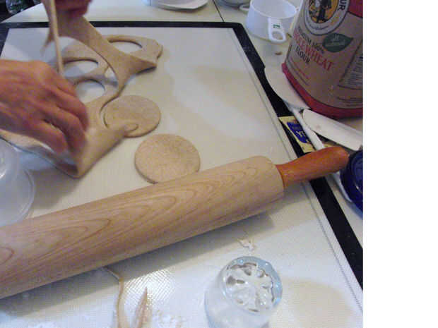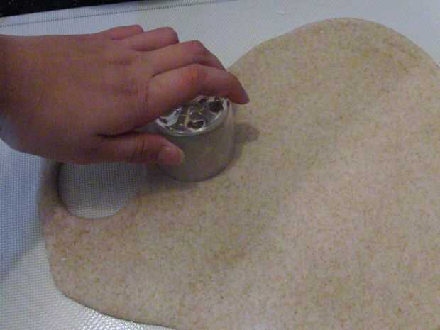 Después de 10 minutos, estirar la masa con el perno de balanceo. Asegúrese de que la masa es suficientemente delgada para su gusto. La siguiente parte es para cortar las formas de Pac-Man. Sea creativo con las cuchillas. Traté de cuencos, vasos, cortadores de la galleta y muchas otras cosas alrededor de la cocina. Incluso puede tomar un cuchillo y cortar fantasmas de Pac-Man. Una vez agotado como gran parte de su masa como podría rodar hacia fuera un círculo con los restos (no quiere que trabaje más la masa).