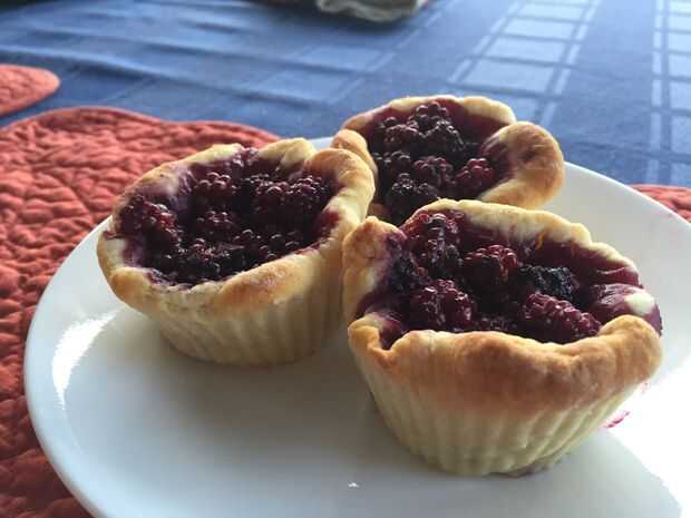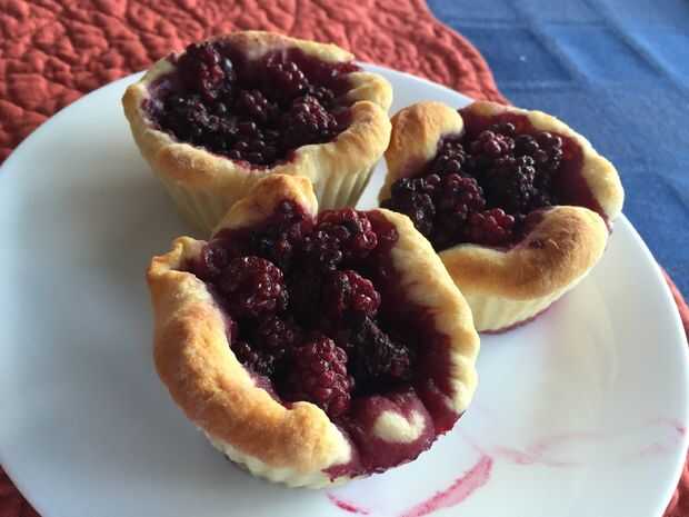 Mi mamá y yo estábamos caminando desde casa de mi abuela a una nueva panadería en la ciudad y pasamos por racimos de zarzamoras. Volví de un largo día de piscina y encontrar las bayas que habíamos recogido en la nevera. Demasiado cansado para hacer la corteza había improvisado y utiliza lo que teníamos en la nevera. Esto resultó escamosa y dulce.