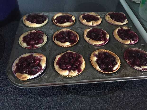 Compré algunas moras enormes y pareció que podría ser una buena idea para hacer pequeñas tartas donde encajaría exactamente una de las bayas.Resultó muy bien y su muy simple también.Es el alimento perfecto para traer a lo largo para una fiesta de ver