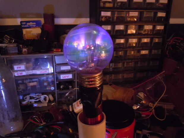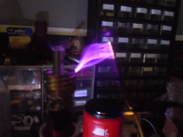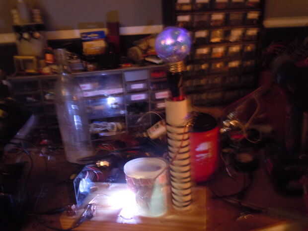 Cómo funciona: primero fuera de la red pasa por un transformador de alto voltaje y carga del Banco de capacitores. Cuando se hacen las tapas de carga dejan la alta tensión del transformador de "pasar" a través de ellos. Durante esa fracción de segundo (a rápido para un ser humano para detectar) el arco saltará a través del boquete de chispa, que es automatizado con de RSGTC, las tapas se descargan en la bobina primaria. Aquí es donde entra resonancia, la rápida acción de los casquillos y boquete de chispa rápidamente induce un campo electromagnético alrededor de la primaria, lo que muchos no saben es comienza apagado como baja tensión que se acumula cada vez la brecha de la chispa se dispara hasta que crea tensión extra alta