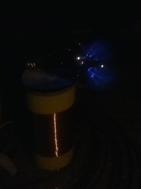 esto es una bobina de tesla mini muy barata hecha de cosas tenía por ahí.Cómo funciona: "electricidad fluye en C1 hasta que un voltaje alto se ve a través de G1. Cuando este voltaje es suficientemente alto, una chispa salta a través de la brecha y pe