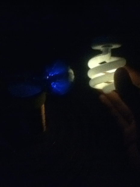 Aquí están algunas fotos de mi pequeña bobina de Tesla, me sorprende que mi iTouch no conseguir fritos, pero en los videos se puede ver una pequeña distorsión. Los 2 primeros cuadros están llenos de las banderolas atravesando un argón estándar 60 vatios bombilla incandescente. Las 2 últimas fotos son de un CFL sin el circuito y la base, pero hay suficiente electromagnetismo pasando por el aire para excitar el fósforo en el bulbo... Iluminación inalámbrica.