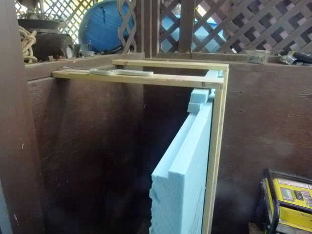 Hice una estructura de apoyo muy minimalista. Me imagino que los paneles de espuma de poliestireno son casi estructurales. Lo único que necesita, es que la necesidad de paneles sostiene en su lugar. No apoyará carga. Además, las fuerzas incluso de lado a lado son inexistentes. Los paneles no se pueden mover de lado a lado porque golpee en la escalera en un lado y en la puerta en el otro. El panel superior también topa en el parante de la puerta.