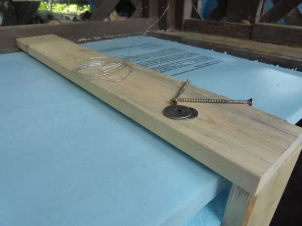 Cuidadosamente corte los paneles interiores de tamaño y había colocado en su lugar. Para mantenerlos en su lugar, hice un sistema de fijación muy simple. Consiste en dos tornillos y dos arandelas de defensa algunos cables. Taladré un agujero a través del 1 * 4 y el panel. Empujé un lazo de alambre a través de ambos. En el interior, había pegado la arandela de defensa a través del lazo del alambre, luego poner el tornillo a través del lazo. En el exterior me bastante mucho lo mismo. Pensé que iba a tener que girar el tornillo alrededor de apretar, pero he encontrado que solo torcer el alambre apretado y agradable ofrece apoyo suficiente. (No hay mucho apoyo es necesario, todo lo que necesitamos es para asegurarse de que los paneles de permanecen en el lugar, y que no es demasiado descuidado. Apenas necesitan ser ajustados apretadamente al 1 * 4.)