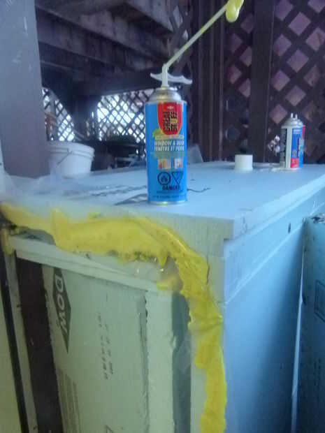 Necesitaba hacer un buen sello hermético entre el sótano de la raíz y la puerta. Para ello, rociaron espuma entre la plástica y la capa externa de espuma de poliestireno. Yo esto en rociar mientras la puerta se abrió, luego cerró la puerta y deje que se cure. No endurece muy rápido, así que tuve mucho tiempo para ponerlo en, a continuación, cierre la puerta. Conseguir un buen cierre hermético, pero el plástico mantiene la espuma se adhiera a la puerta. Que, por supuesto, sería malo.