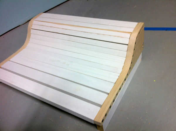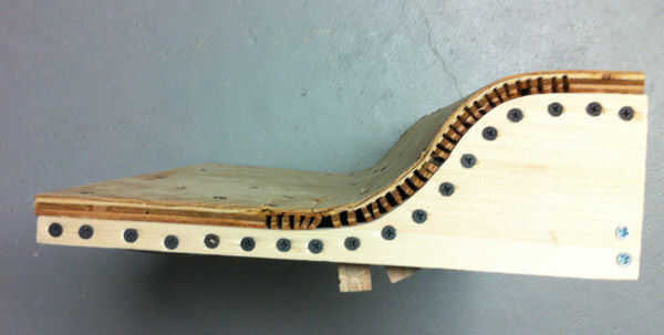 En mi mente, si yo podría hacer la rampa el resto sería un pedazo de pastel. Usando la plantilla adjunta de la rampa, tomar dos piezas de madera contrachapada de 1/2" desechos y sujetarlos juntos. Trazar el patrón y cortar las piezas con un rompecabezas o sierra de marquetería, tómate tu tiempo, esta etapa es fundamental para el juego para ser jugable. Una vez que se corta la forma, la arena para ser liso e incluso. A continuación damos 1 x 2" corte por lo que cuando adjunta en el interior de las formas de la rampa la anchura total es 18". Asegúrese de que el 1x2s se unen para que en la curva y no sobresalen por encima de él. A continuación se adjunte una hoja de madera contrachapada sobre la rampa. Hay una técnica que aprenderemos ahora llamada ranurado. Esto ayuda a la madera contrachapada de la curva. Utilizando una tabla de sierra corte arboledas en la madera contrachapada cada 1/8" o algo así. Suficiente espacio entre los cortes que tiene aproximadamente el tamaño del corte sí mismo. Lo hice para la longitud de la curvatura a través de la madera contrachapada. Una vez kerfed remojar la hoja de madera contrachapada con agua tibia durante al menos una hora. Debe ser flexible pero todavía bastante fuerte. Un ayudante es agradable para esta parte. A partir de la parte superior de la curva de Fije la madera contrachapada con tornillos pequeños para madera. Comenzar a doblar la madera contrachapada en la curva y coloque los tornillos en cada pocas pulgadas. Trabajo lentamente asegurándose de que no se agriete la madera contrachapada. Una vez completamente conectado permite la madera secar por un día, como medida de precaución me llenado en las ranuras de corte con el MDF casero. Tomé algunos serrín (si no tienes será poco) y mezclado con cola para madera. Quité unos listones a la vez y extensión la madera pegamento / sierra polvo mezclar dentro de las arboledas. Esto añade fuerza la bola se golpea esta rampa miles de veces a lo largo de muchos años. Los cortes de llenado es opcional, pero recomendado fuertemente. El paso final es prueba de la rampa una vez seco. No te preocupes cabezas de los tornillos expuestos en este punto, pero intente conseguir que hundido en la madera contrachapada - cuidadosamente. Finalmente se cubrirá esta rampa en cork. Considerar este proyecto oficialmente en marcha - esto es realmente una de las partes más difíciles de la máquina entera. No te preocupes, aguardan más desafíos.