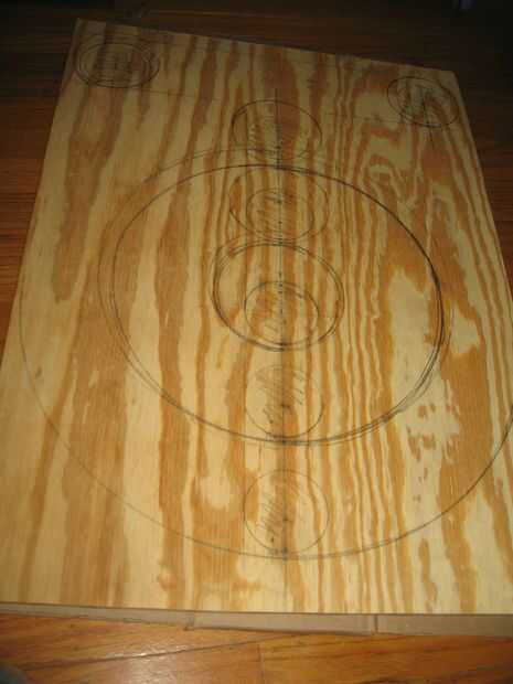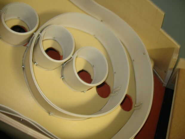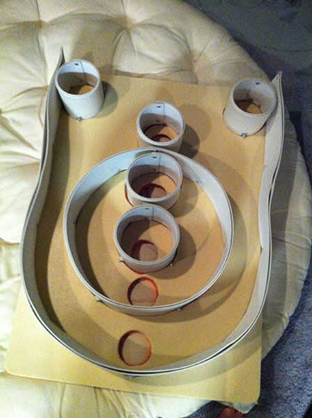 Encontrar los materiales adecuados para los anillos es crucial para un cuadro realista. Resulta 4" Cala goma Base obras maravillosas. Para la durabilidad mía hice lazo alrededor de dos veces. El principio del bucle y final del bucle debe solaparse en unos 3/4" donde usted remache les juntos. Mantenga la tirantez de los anillos de ajuste y mida el diámetro de ellos. Los 100 anillos son 3,4" amplia, es el anillo 50 4,6", el anillo de 40 es 5", el anillo 30 es 5,8" y el anillo grande que contiene el anillo de 40 y 30 es 14,8". La forma externa final, grande que no medir. Sólo presenta el material en la madera contrachapada y había marcado los cortes. Para cortar la base Cala sólo usé una L en forma de regla y una navaja de afeitar. Corte la base Caleta en varias pasadas de luz, no trate de cortar completamente a través de él en una sola pasada de la cuchilla. A continuación solía cinta Sujete los anillos para asegurarse de que correctamente medido. Unos agujeros perforados y clavado los anillos cerrados con dos remaches. Lo sentimos por la falta de fotos de progreso pero al final resultado debe aclarar el proceso. Coloqué los aros en el área de puntuación para asegurarse de que todo encaja. Antes de colocar los anillos perforé los 3" agujeros en la madera contrachapada. Usted puede hacer los agujeros suave les lijado. También tomé algunos fieltro y grapas alrededor de los orificios para proteger aún más las bolas de madera. Una vez que los anillos son del tamaño correcto y remachada, tomé mi L en forma de abrazaderas de las esquinas y decidido dónde colocar en los anillos para sujetar a la mesa. Marque los puntos con un lápiz y perfore los orificios piloto. Os adjunto un lado de la abrazadera al ring y remachadas en lugar y conectar la parte inferior de la abrazadera a la mesa. Ver las fotos para la colocación de la costura. Una vez que los anillos se unen a la mesa que quería añadir algunos espuma de PVC para amortiguar el sonido de la bola golpea la madera. Esto es donde la alfombra de la recepción entra en juego. Usando mi técnica favorita de corte y cinta adhesiva de papel de construcción, pude hacer las plantillas para todas las áreas que necesitan espuma. Una vez tuve las formas de papel de construcción colocó en la espuma, trazado con un lápiz, luego corte con cuidado las formas de la espuma con una maquinilla de afeitar. Luego poner pegamento sobre la madera y coloca la espuma en lugar. Si no encajan perfectamente en las formas de la espuma entonces segarla con la afeitadora antes de fijar. Había pensado adelante que esto probablemente sería un buen momento para fijar los números de vinilo a los anillos. Esperé hasta el final de ese paso. Usted ahora tiene la rampa y zona de puntuación - el resto es muy sencillo comparado con estos pasos...