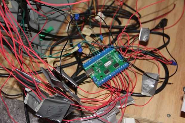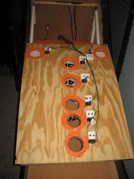 Al final del día, el cableado va a ser un desorden complicado visualmente. Los cables están por todas partes! Ojala alguien figuras cómo organizarse mejor sobre cableado, pero la mía es puro caos. Esto es por que es una buena idea para marcar todos los cables con cinta de enmascarar y etiquetados (Ex: 10 rojo) si una luz tiene que ser reemplazado en el futuro. Comience destornillando la zona de calificación y bancos para que los objetivos de 100 todavía están en la parte superior.