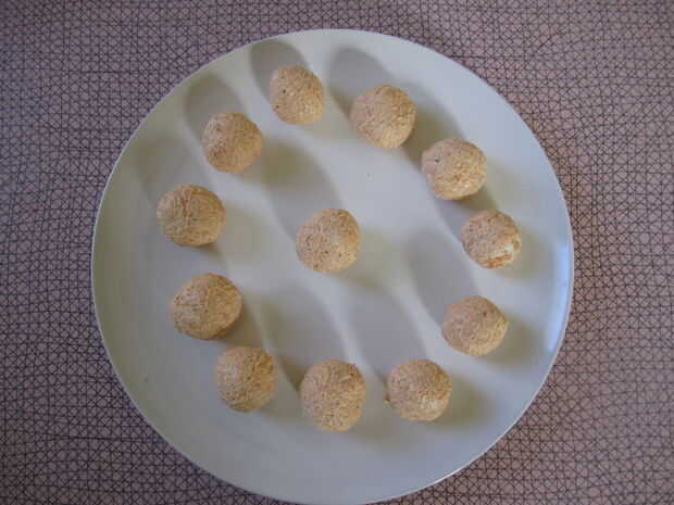 Tomar lo suficiente de la mezcla de queso entre las manos para formar una pequeña bola, aproximadamente 1 1/2 pulgadas a través. Debe ser capaz de obtener doce bolas de igual tamaño de esta cantidad de queso.