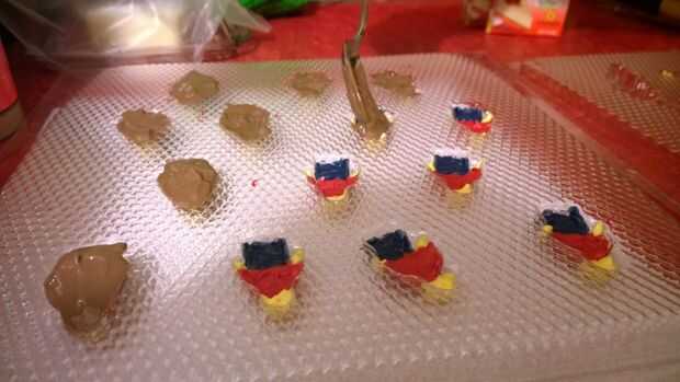 Hice una caldera doble de la misma olla y un recipiente de metal. Luego sólo tienes que mezclar los trozos alrededor hasta que todos ellos se funden. Llené en las partes posterioras de las figuras con el chocolate con leche llano con una cuchara.