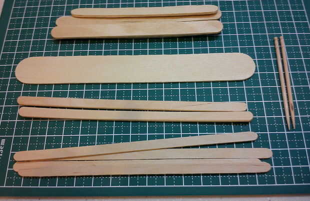 Fueron utilizados como el BSG Colonial Viper antes de este proyecto, no un montón de materiales.  La estructura base del avión era de palitos de tamaño regular.  Agitadores de café madera con espesor variable fueron utilizados para los pilones de ala motor y cabina/fuselaje, un palillo de dientes (para las puntas del ala secundarias) y un depresor de lengüeta de diluido (para las alas secundarias y ala delta) fueron los otros materiales utilizados para esta compilación.