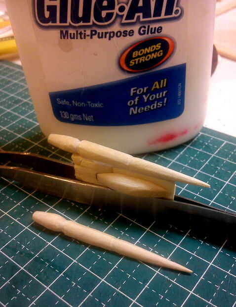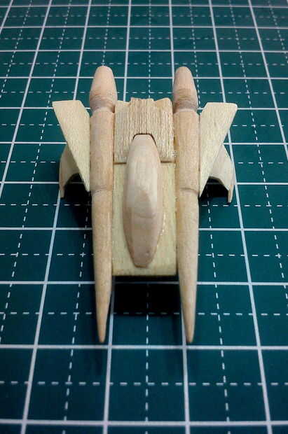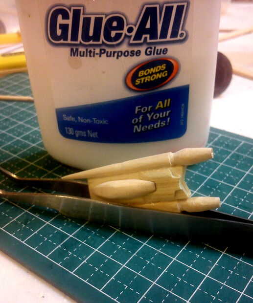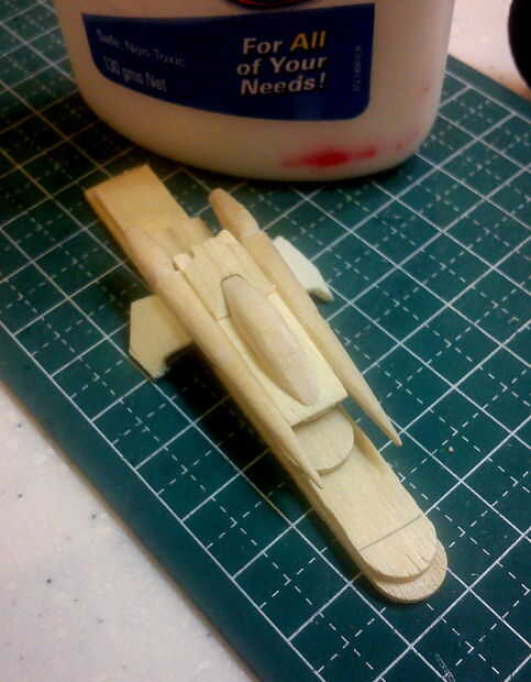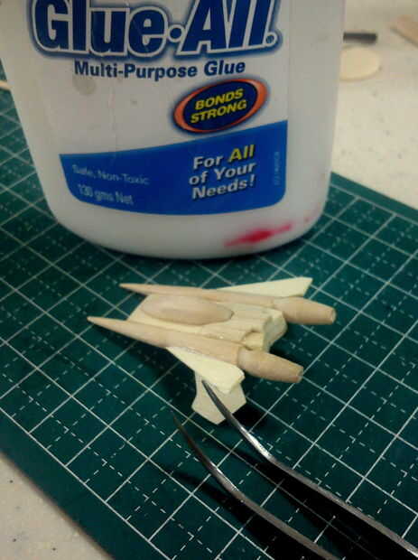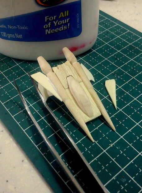 Las alas auxiliares fueron agregadas a continuación. Utilicé tres capas de repuesto que Popsicle palos para sostener el fuselaje montado mientras seca el pegamento las alas de auxiliar a los pilones. Tres capas eran suficientes para apoyar la posición de 45 grados de las alas de auxiliar con los pilones de motor/armas.