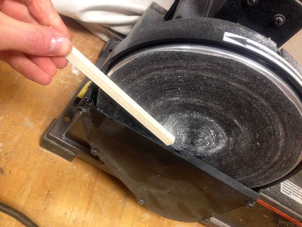 El último paso para la plantilla para crear una cuña. Esta cuña se utilizará para asegurar su madera durante el corte y también mantener la tira de madera otra vez la tapa roja. Todo lo que se necesita es tomar un trozo de madera y arena hacia abajo por lo que va estrechando de muy fino a aproximadamente 1/4". Utilicé una lijadora de disco para ello. También se podría hacer a mano, usar una lijadora orbital o posible una pre hizo cuña de Lowes trabajaría demasiado.