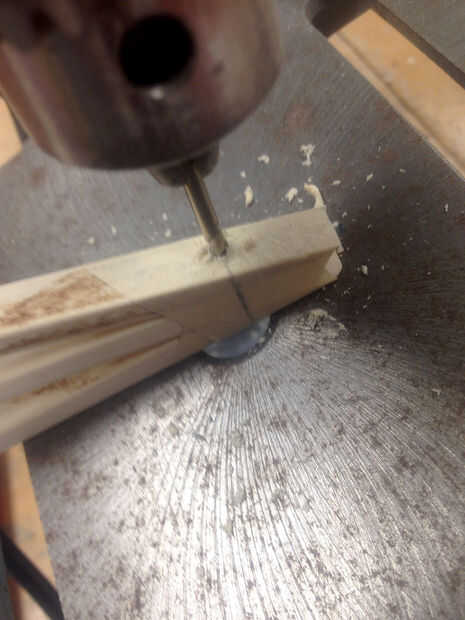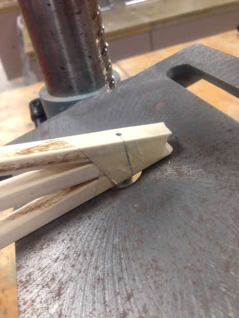 Con un taladro o un taladro de mano, taladre un agujero de 1/8' hasta las tres piezas. Localizar el punto colocado en el lado en el último paso y perfore un agujero perpendicular a la pieza central. Para facilitar la puse la mesa en mi taladro en ángulo. El ángulo fue fijado por el ojo, con el reseteo de caballete en la mesa de ajustar el ángulo hasta que el medio quede perpendicular a la broca.