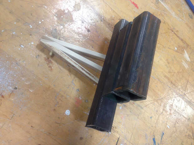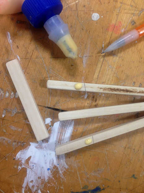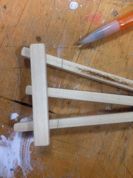 Casi ahí! Coloque el caballete sobre la mesa asegurándose de que la pieza media tiene el bisel hacia arriba. Ahora coloque el travesaño en la parte inferior de la base perpendicular a la pata del media. Ajuste la altura de lo que se ve bien a usted o el tamaño de la pieza que llevará a cabo. Haga una marca sobre la pieza para calibrar después de coloca el pegamento. Pegamento para madera toma agregar un punto de pegamento en los dos fuera de las piernas debajo de la línea dibujada. Volver a colocar el travesaño y poner algo pesado sobre las barras transversales para actuar como un peso. Dejar cocer durante un par de horas. De sujeción o colocación de cinta alrededor de las piezas puede utilizarse, pero muchas veces se mueve las piezas alrededor de a mucho y es difíciles de alinear.