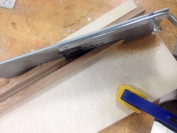 Con las mediciones realizadas y las líneas dibujadas es hora de crear los surcos para guiar nuestros cortes repetidos de los caballetes. Para guiar los dientes un poco más fáciles, tomé una cuchilla x-acto y marqué la línea muchas veces. Hasta cortar una segunda línea del mismo grosor de la hoja de Sierra de mano y quita un poco de la madera en el medio. Ahora con una sierra de mano sigue esas dos líneas o surco y cortar las tiras de sujeción hasta la madera base. El tablero para una mesa de sujeción puede facilitar este paso. Se corte en la madera base, que no alterará la plantilla en todas formas (que no sea su mirada).