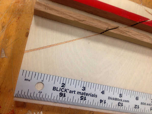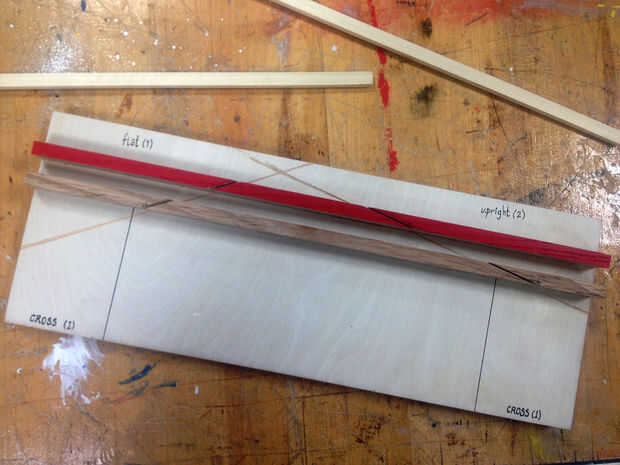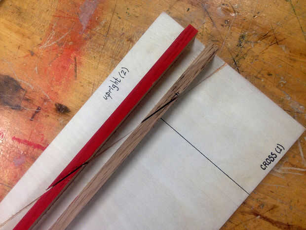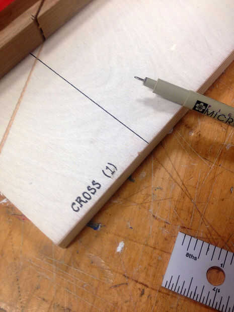 2. debajo de la tira inferior miden 2 3/4" de la izquierda y de derecha. Hacer la misma medición en la parte inferior del tablero. Las dos marcas le permitirá a la línea hacia arriba y trace una línea vertical. Esta es la Cruz (donde su trabajo se pone en el caballete). Marque la línea con un rotulador y escribir también Cruz (1) en ambos lados para indicar la pieza.