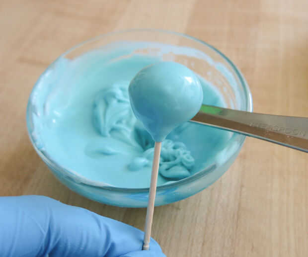 - Una vez que se cubra (probablemente será grueso, y eso está bien), manténgalo en un ángulo de 45 grados a la taza y golpee cuidadosamente por lo que el exceso gotea apagado. Usted tendrá que escurrir el exceso o goteará abajo el palo.