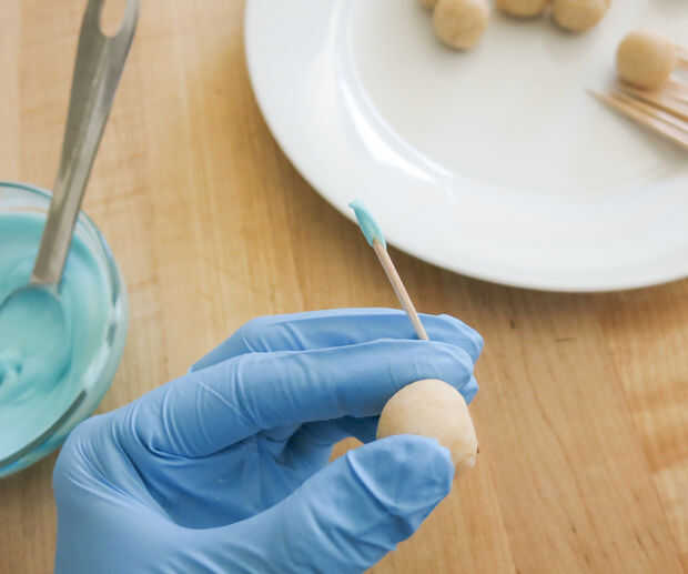 Mientras sus bolas de pastel en la nevera, prepárate tu soporte de la torta o la línea una bandeja con papel de cera.